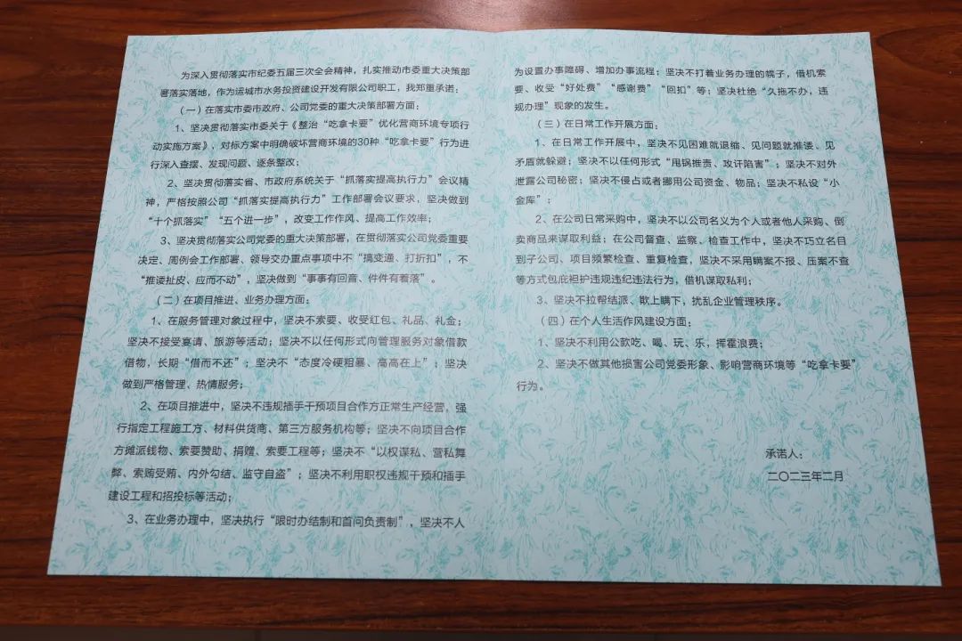 會上,公司黨委委員、紀委書記王望寬宣讀了市水投公司《整治“吃拿卡要”優(yōu)化營商環(huán)境專項行動實施方案》。根據(jù)此次專項行動提出的30種“吃拿卡要”行為,結(jié)合公司實際,從落實市委市政府、公司黨委的重大決策部署方面;項目推進、業(yè)務(wù)辦理方面;日常工作開展方面;個人生活作風建設(shè)方面,制作了水投公司整治“吃拿卡要”優(yōu)化營商環(huán)境專項行動承諾書。