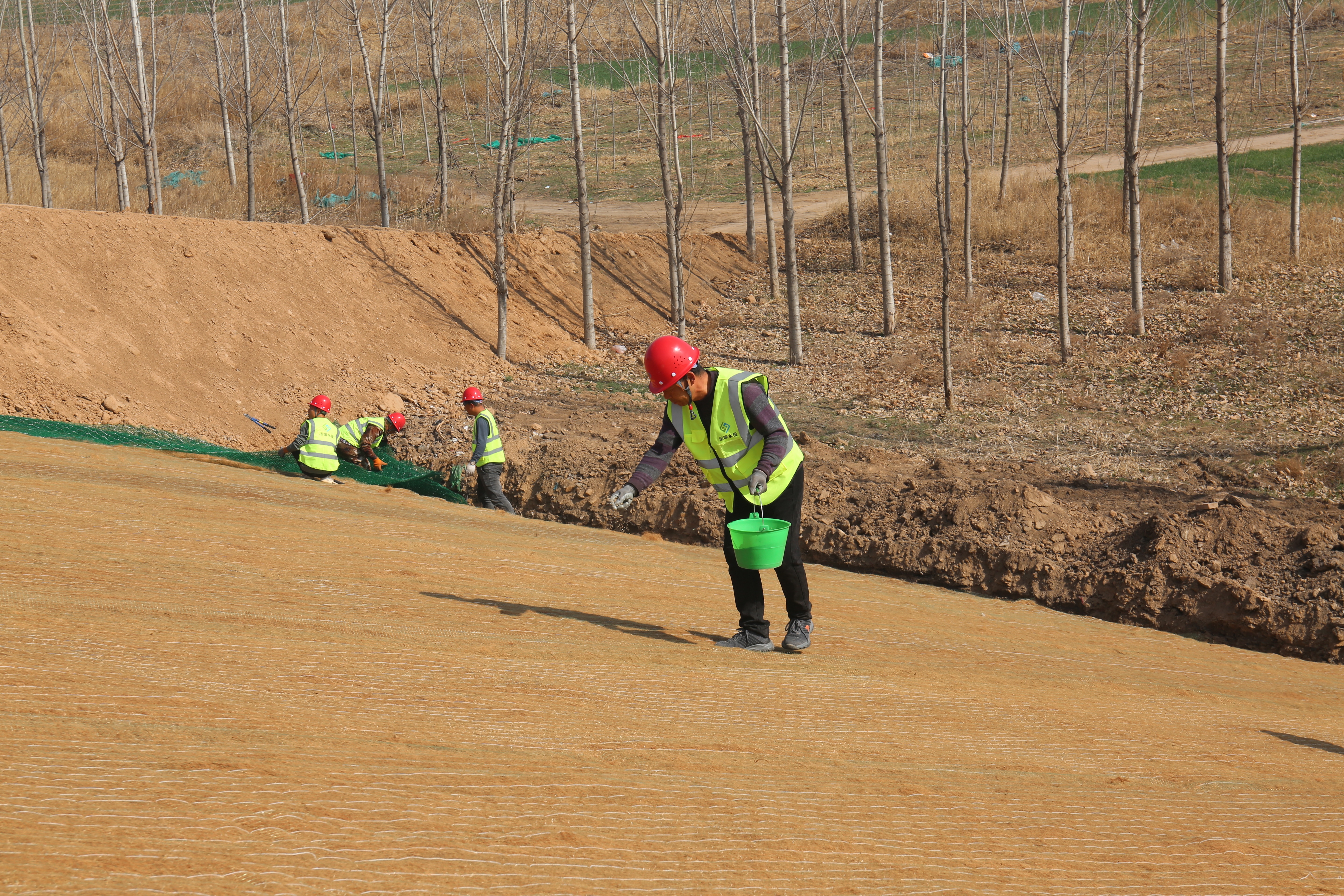施工現(xiàn)場,工程機械、運輸車輛、施工人員正在加緊作業(yè)。一片片椰絲毯經(jīng)過清除坡面雜物、坡度整修、開挖坑槽、播撒草籽等八道程序才能完好鋪設(shè)在大壩上。椰絲毯是一種新型環(huán)保材料,具有良好的吸水性、保濕性和透氣性,這種環(huán)保材料既可以起到穩(wěn)固河道邊坡、防止河岸沖刷破壞的作用,同時還能優(yōu)化生態(tài)環(huán)境。