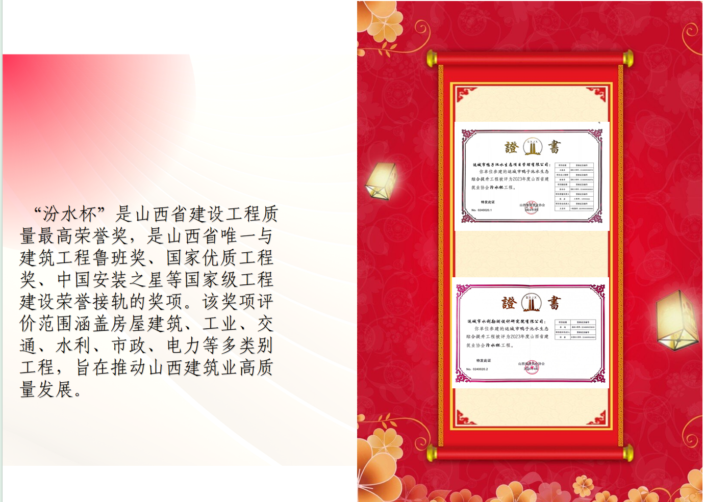 2024年以來,由運(yùn)城市水利勘測設(shè)計(jì)研究院有限公司設(shè)計(jì)的《鴨子池水生態(tài)綜合提升工程》一舉斬獲“山西省勘察設(shè)計(jì)協(xié)會(huì)設(shè)計(jì)三等獎(jiǎng)”、“山西省建筑業(yè)協(xié)會(huì)‘汾水杯’獎(jiǎng)”、“中國市政工程協(xié)會(huì)最高水平評價(jià)工程獎(jiǎng)”等三項(xiàng)行業(yè)殊榮。